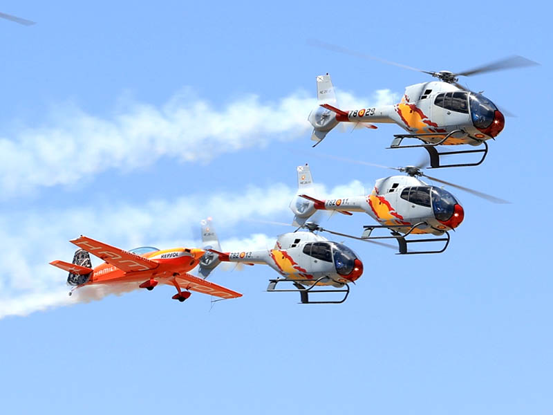 El pasado 23 de junio de 2022 se produjo un hecho histórico en nuestro país. Juan Velarde, piloto de vuelo acrobático español participó en la primera vez en España que un avión acrobático civil vuela integrando en el equipo de helicópteros. Los vuelos de entrenamiento fueron un éxito, consiguiendo una coordinación total entre el Extra 330 y la Patrulla Aspa, con la dificultad añadida de las velocidades y características de vuelo tan diferentes entre el avión y los helicópteros.