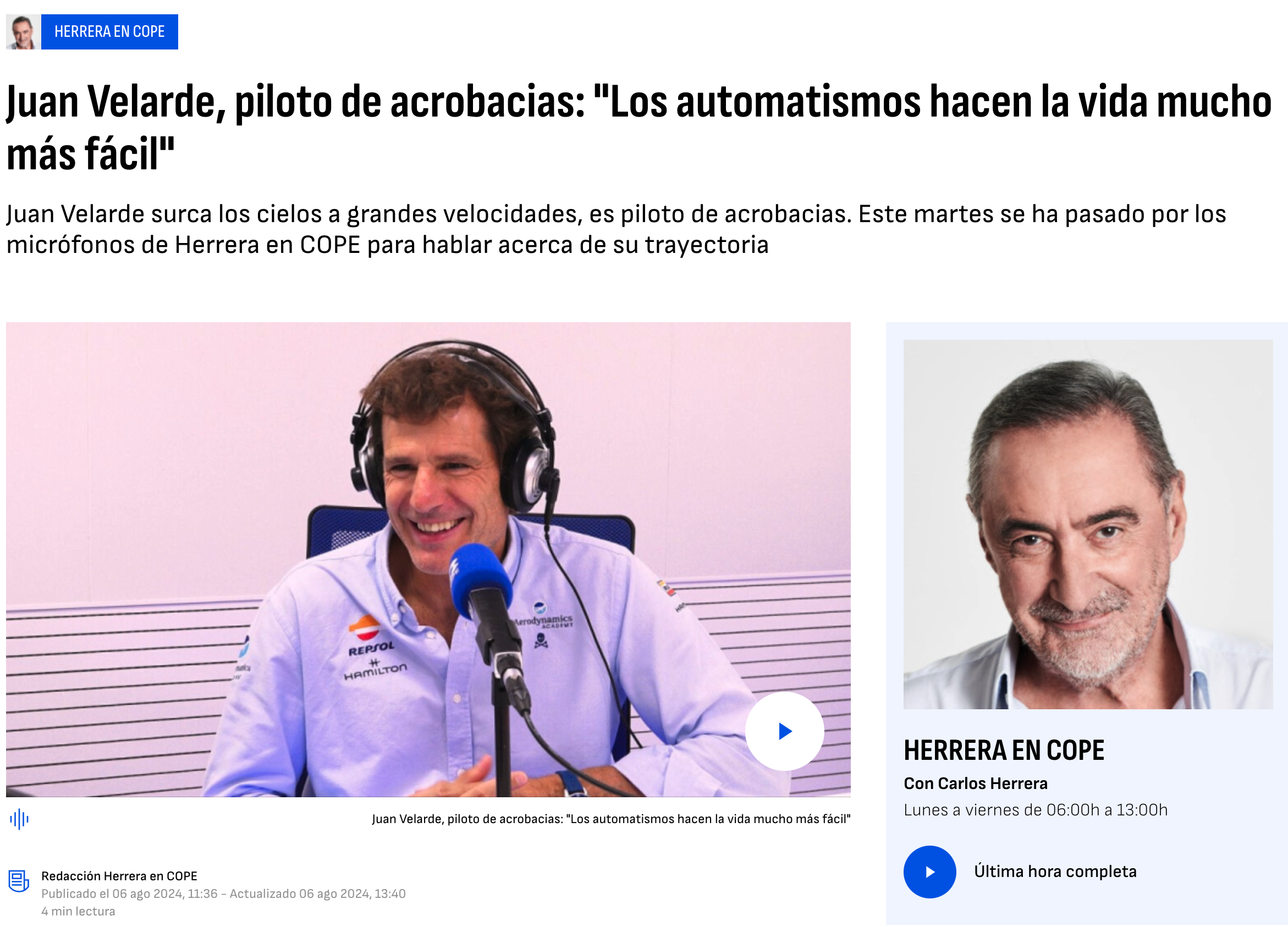 La participación de Juan Velarde en el programa de Fórmula 1 de MovistarTV tuvo su continuación en esta entrevista. El piloto español de vuelo acrobático y de velocidad charló con Antonio Lobato, Pedro de la Rosa y Toni Cuquerella...